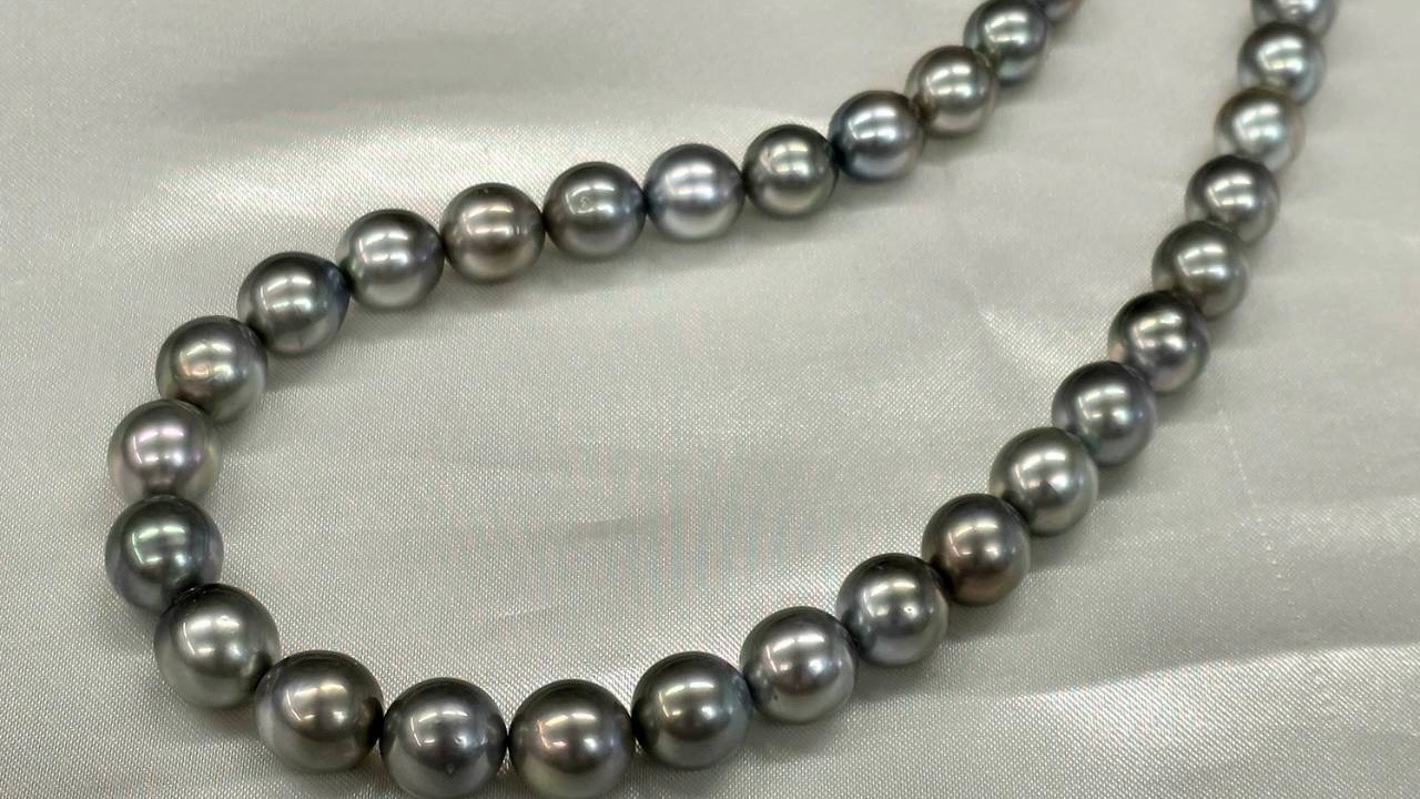 落ち着いた色合いが魅力の天然グレーカラーの黒蝶パールネックレスです。