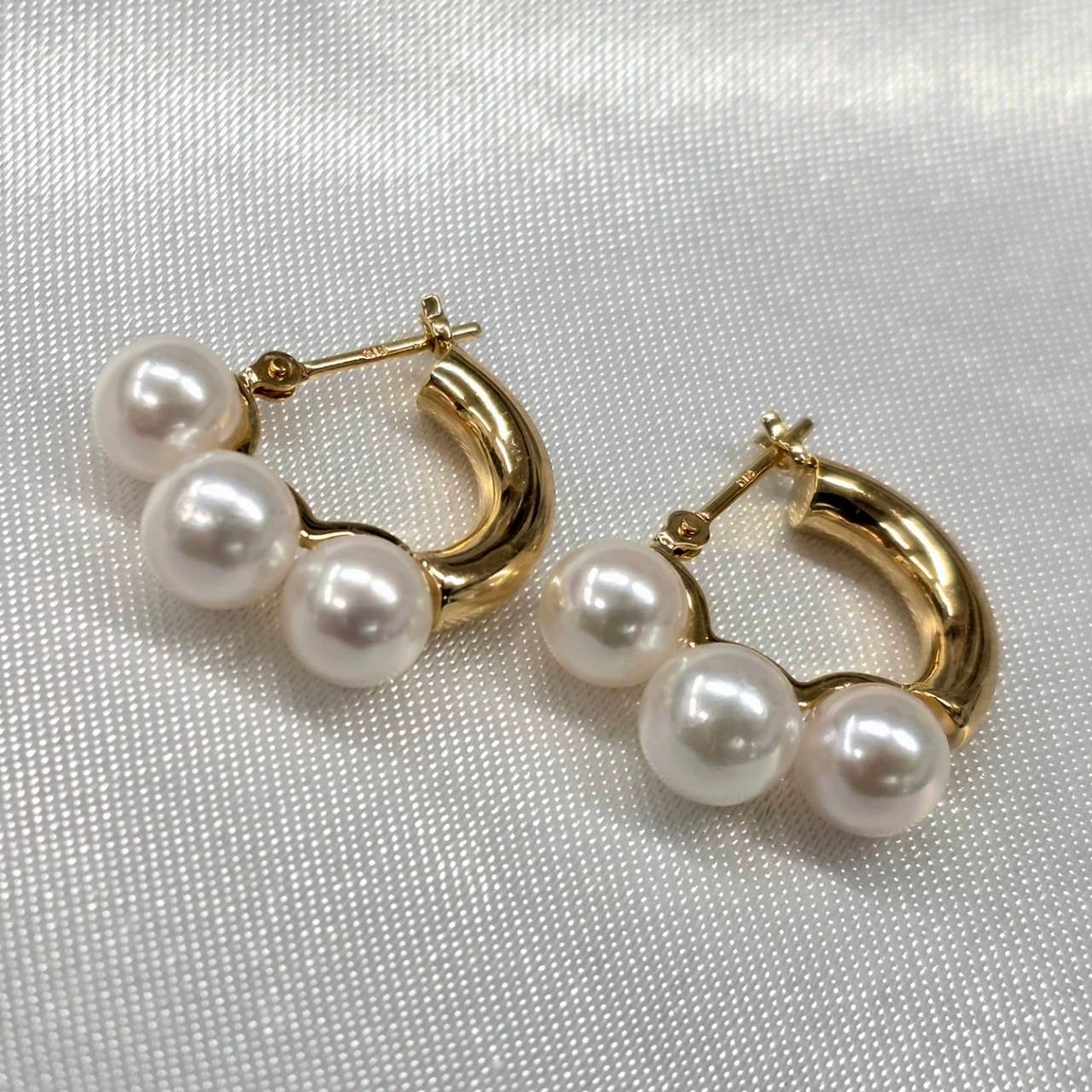 高品質なK18アコヤパールを使用した、洗練されたデザインのピアスが登場です。このピアスには、一つ一つ丹念に選ばれた5.5mmのアコヤパールを縦に3つ並べた贅沢な作りで、存在感は抜群です!