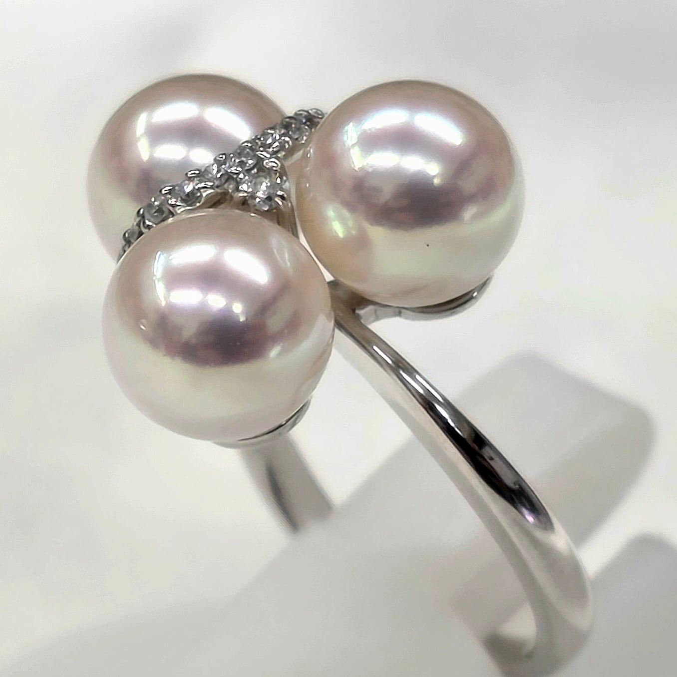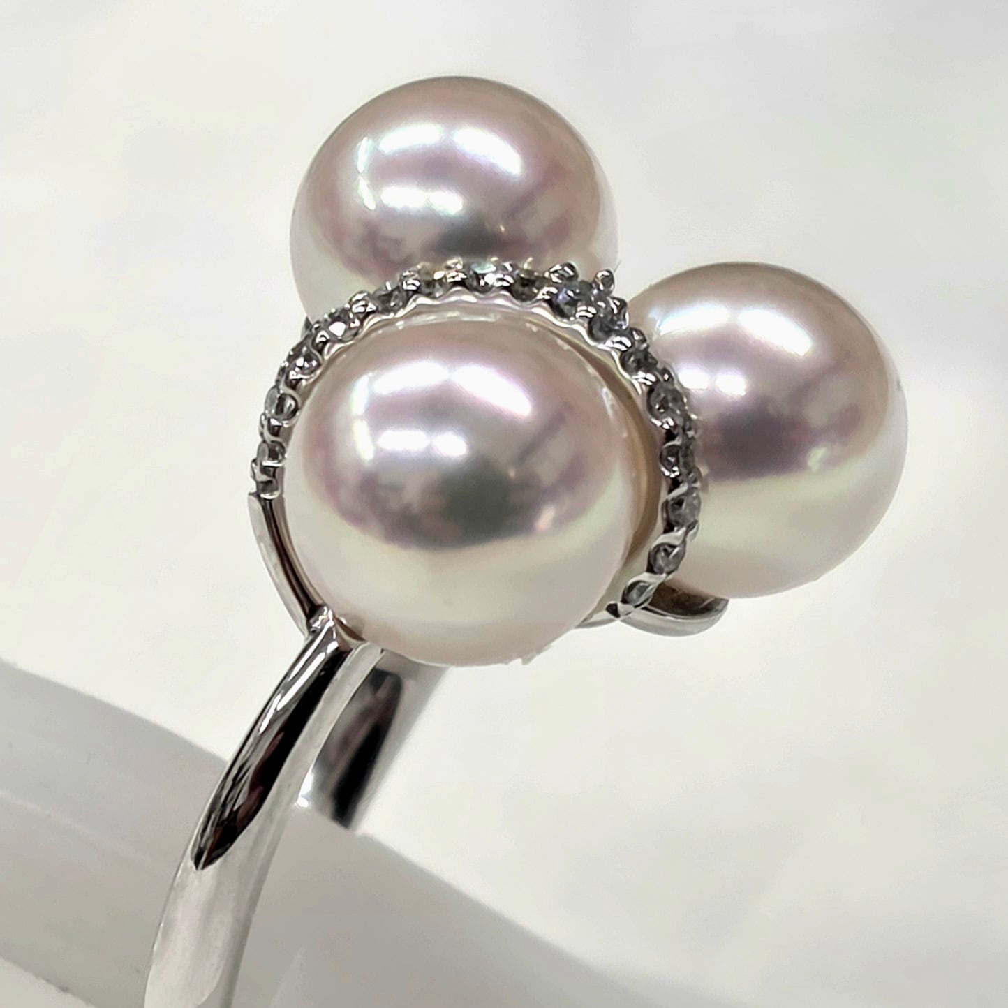 高品質な天女級の艶やかなアコヤパールを贅沢に3個使用したK18WGアコヤパールリングが登場です。