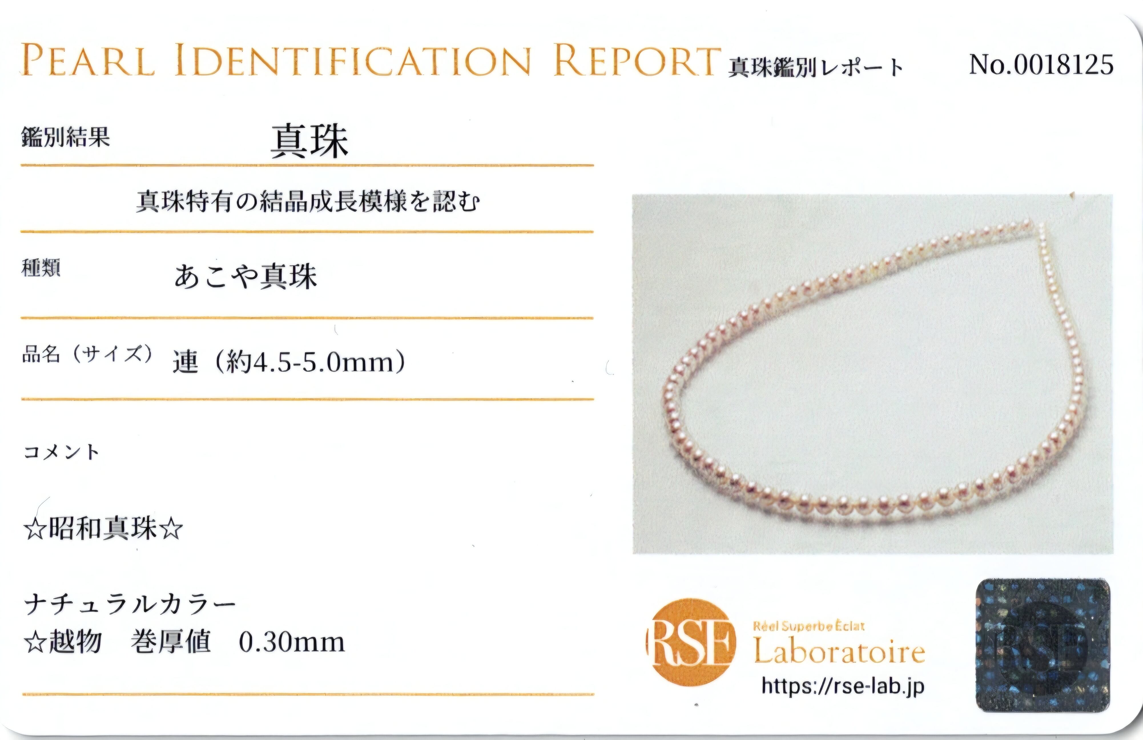 強い光沢があり巻が厚く傷が少ない真珠のプレミアム呼称『昭和真珠』の鑑別カードが付属しており、品質に対する信頼も抜群です。