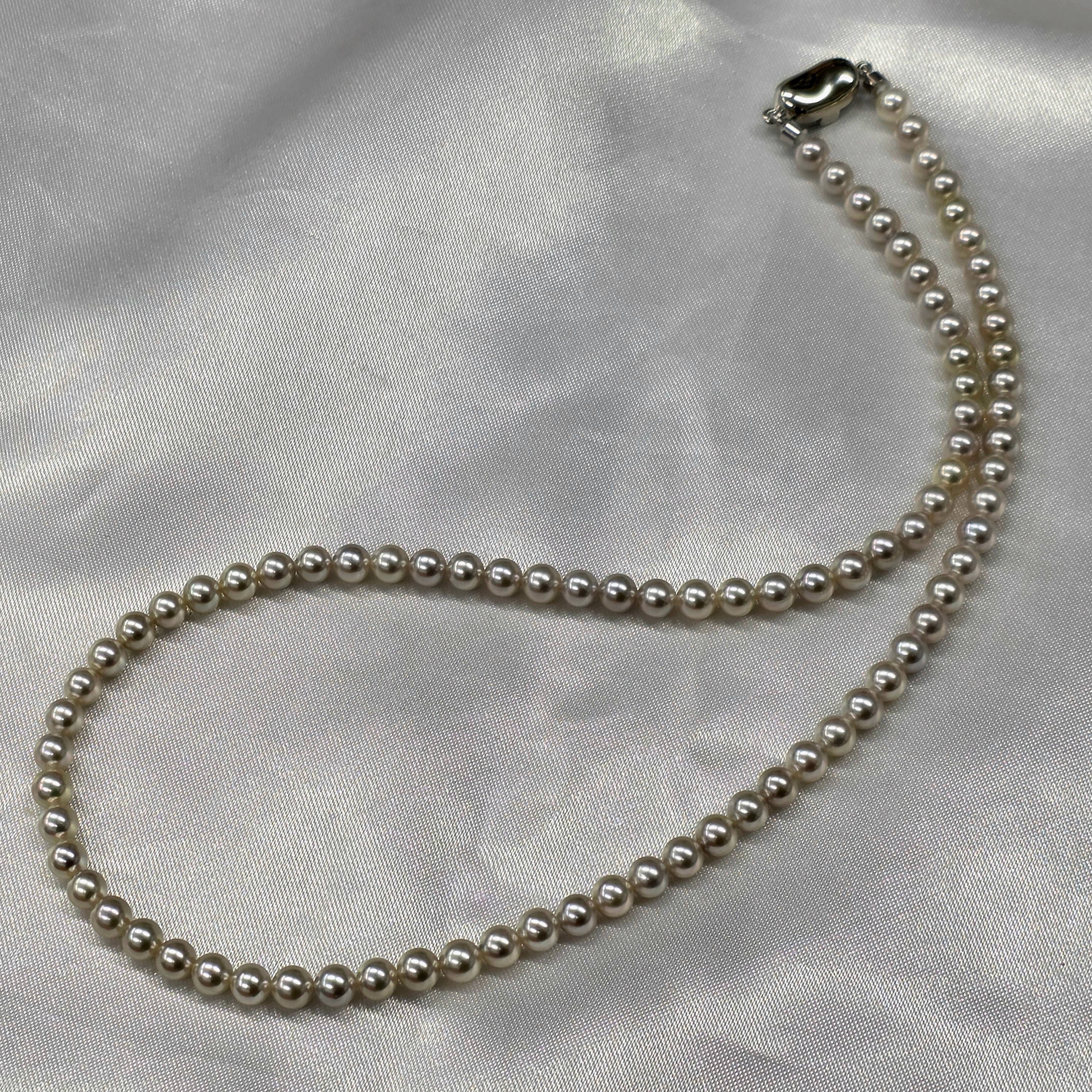 玉のサイズは4.5-5mmと小ぶりですが、その強い光沢が存在感を引き立て、多彩なシーンにぴったりなアイテムです。